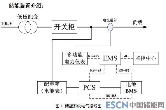 系统测控装置实时采集用电负载功率,作为储能系统充放电的控制依据,当负载功率超过设定的启动放电阈值时,储能系统开始放电和市电共同为负载供电,当负载功率低于设定的停止放电阈值时,储能系统停止放电;当负载功率低于设定的启动充电阈值时,储能系统开始充电运行,充电功率可调节,确保储能系统充电功率和负载功率不超过变压器的总功率,当负载功率高于设定的停止充电阈值时,储能系统停止充电。